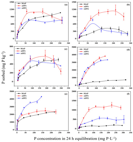 Adsorption isotherms of total P from different P sources across various soils: (a) red soil, (b) fluvo-aquic soil, (c) acidic purple soil, (d) calcareous purple soil, (e) laterite soil, and (f) cinnamon soil. MAP, monoammonium phosphate; APP1, ammonium polyphosphate with two P species coexistence; and APP2, ammonium polyphosphate with seven P species coexistence.