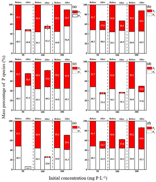 P species changes in APP1 solutions before and after adsorption by soils: (a) red soil, (b) fluvo-aquic soil, (c) acidic purple soil, (d) calcareous purple soil, (e) laterite soil, and (f) cinnamon soil. P1, orthophosphate; P2, pyrophosphate.