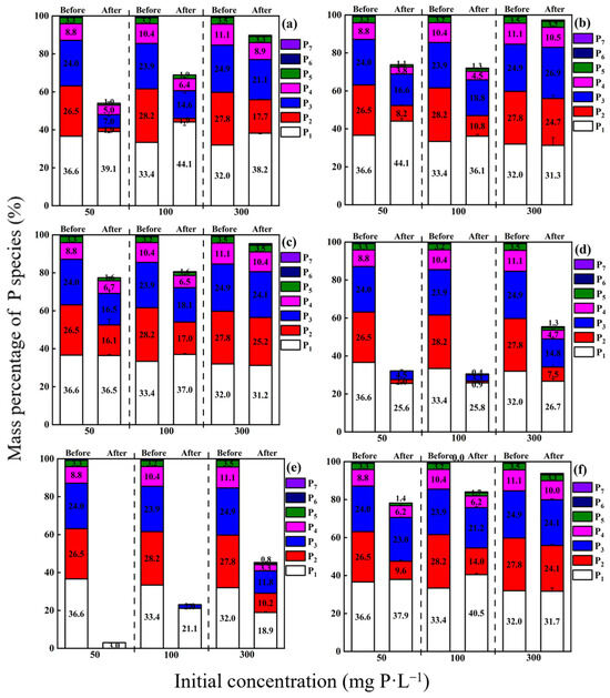 P species changes in APP2 solutions before and after adsorption by soils: (a) red soil, (b) fluvo-aquic soil, (c) acidic purple soil, (d) calcareous purple soil, (e) laterite soil, and (f) cinnamon soil. P1, orthophosphate; P2, pyrophosphate; P3, tripolyphosphate; P4, tetraphosphate; P5, pentaphosphate; P6, hexaphosphate; and P7, heptaphosphate.