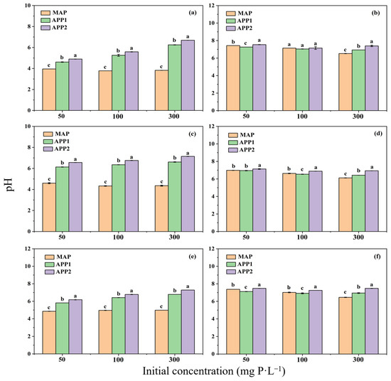 pH of adsorption equilibrium solutions of different soils: (a) red soil, (b) fluvo-aquic soil, (c) acidic purple soil, (d) calcareous purple soil, (e) laterite soil, and (f) cinnamon soil. MAP, monoammonium phosphate; APP1, ammonium polyphosphate with two P species coexistence; and APP2, ammonium polyphosphate with seven P species coexistence. The means with same letter indicate no significant differences according to LSD (p < 0.05) by each parameter under the same initial P concentration.