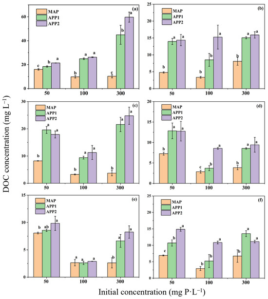 Concentrations of dissolved organic carbon (DOC) in the adsorption equilibrium solutions of different soils: (a) red soil, (b) fluvo-aquic soil, (c) acidic purple soil, (d) calcareous purple soil, (e) laterite soil, and (f) cinnamon soil. MAP, monoammonium phosphate; APP1, ammonium polyphosphate with two P species coexistence; and APP2, ammonium polyphosphate with seven P species coexistence. At the same initial P concentration, means followed by the same letter are not significantly different (LSD, p < 0.05) for each parameter assessed.