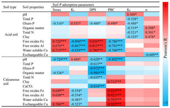 Correlation between soil properties and ΔP adsorption parameters (APP versus MAP). Smax, the P sorption maximum; KL, a constant related to binding energy of P; DPS, the degree of P saturation; PBC, the P buffer capacity; KF, the Freundlich sorption coefficient; and n, a constant related to sorption intensity. Only the significant correlation coefficients are showed. *, **, and *** represent p < 0.05, 0.01 and 0.001, respectively.