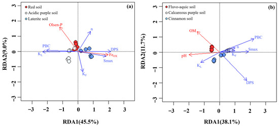 Redundancy analysis (RDA) showing the relationships between soil properties and Δ P adsorption parameters (APP versus MAP): (a) acidic soil and (b) calcareous soil. Smax, the P sorption maximum; KL, a constant related to binding energy of P; DPS, the degree of P saturation; PBC, the P buffer capacity; KF, the Freundlich sorption coefficient; n, a constant related to sorption intensity; Feox, free oxides Fe; and OM, organic matter.