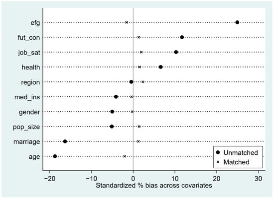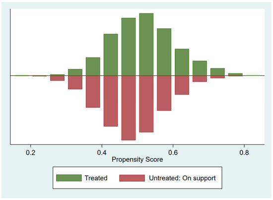 We use propensity score matching (PSM) to further estimate the endogenous relationship between digital literacy and subjective well-being. Figure 2 reveals that the deviation of the standardized mean of all matching variables is less than 50%, and the results after matching are significantly smaller than the standard deviation before matching. Additionally, Figure 3 shows that the vast majority of the samples in the experimental group and the control group are within a common value range. This indicates to an extent that there is no systematic deviation in the process of matching variables, which meets the requirements of balance tests. These results indicate that digital literacy still has an explanatory effect on the improvement of rural residents’ happiness when sample selection bias is taken into account, further supporting the robustness of the results.