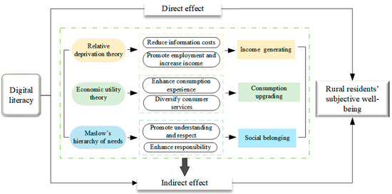 It has been demonstrated that enhancing the digital literacy of rural residents can effectively promote subjective well-being. It is crucial to understand the mechanisms through which digital literacy impacts the subjective well-being of rural residents. With the widespread implementation of digital village construction and network infrastructure, the Internet exerts a profound influence on individuals’ behavior and emotions. In terms of rural communities, leveraging digital technology can enhance their financial management capabilities, employment skills, and information-gathering abilities, thereby generating income and improving overall literacy levels. This enables them to fully enjoy the benefits offered by the digital age while satisfying diverse consumer demands and facilitating consumption structure upgrades. Additionally, digital technology provides various dating platforms that foster communication among residents, which meet residents’ spiritual needs. We explore whether digital literacy enhances subjective well-being among rural residents through its effects on increasing income levels, upgrading consumption structures, and fostering social belonging in order to emphasize its impact on overall digital well-being. Figure 6 displays the mechanism through which digital literacy influences rural residents’ subjective well-being.