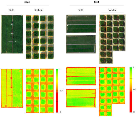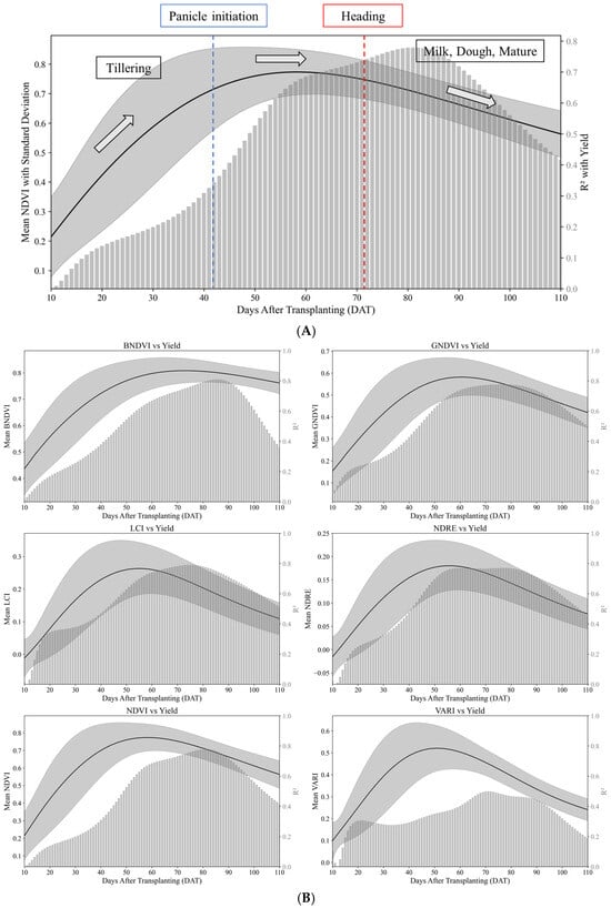 36]. This suggests that the rate and extent of VI decline after heading may be determined by the amount and speed of panicle emergence following nitrogen treatment. These findings highlight that VIs indicate biomass as well as structural changes, such as panicle formation, during the post-heading phase.