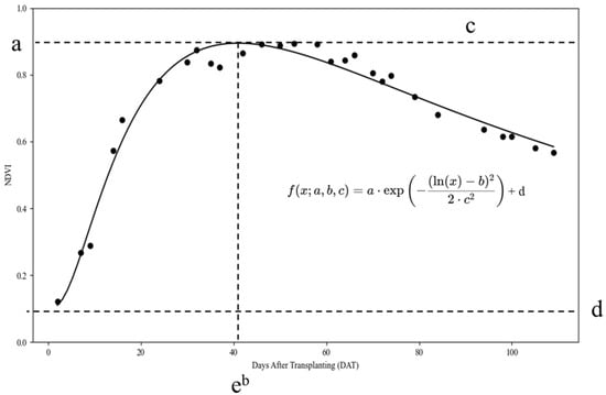 Parameter c, representing the spread or distribution of the NDVI curve, varied with the treatment conditions. Higher nitrogen levels typically correspond to higher c values, indicating a broader distribution of the NDVI curve. In contrast, parameter d, representing the baseline or minimum NDVI value, showed minimal variation across treatments, suggesting that the baseline NDVI values remained relatively stable regardless of nitrogen level or transplanting time.