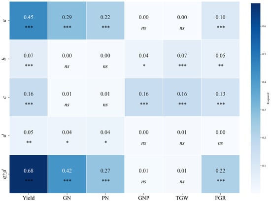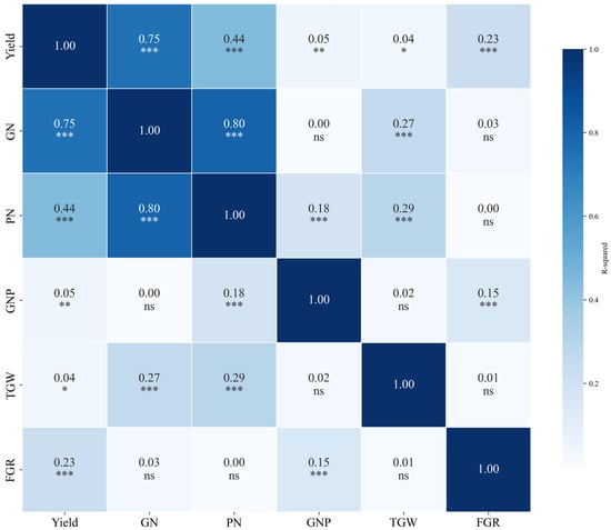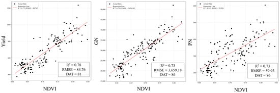 2 was highest for yield, followed by GN and PN. This indicates that VIs are strongly linked to yield as well as to GN and PN, although the strength of these relationships varies by index. However, GNP, TGW, and FGR were not significantly correlated with yield or major yield components, such as GN and PN, at any growth stage. This suggests that these components have a limited influence on yield variability compared with other yield-related factors.