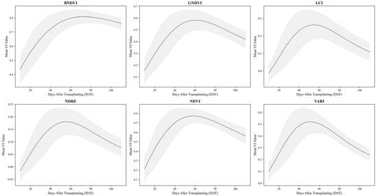 Figure 5 shows the deviations in the log-normal curves for each VI. The shaded regions represent the standard deviation around the mean log-normal model fit, visually representing how each index varied across the treatments.