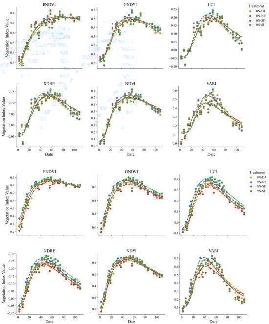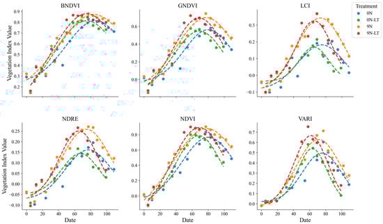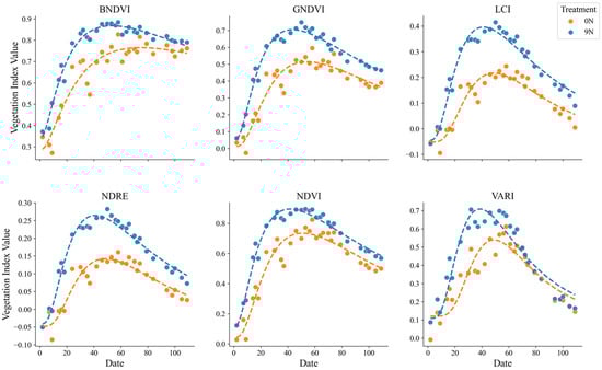 Graphical comparisons were conducted to examine differences among treatments and varieties for each VI fitted as time-series data. Nitrogen application rates influenced the VI curves, with higher nitrogen levels generally resulting in increased values across most indices, indicating improvements in plant health and biomass accumulation. BNDVI, GNDVI, and NDVI exhibited more pronounced peaks and higher values with increasing nitrogen levels.