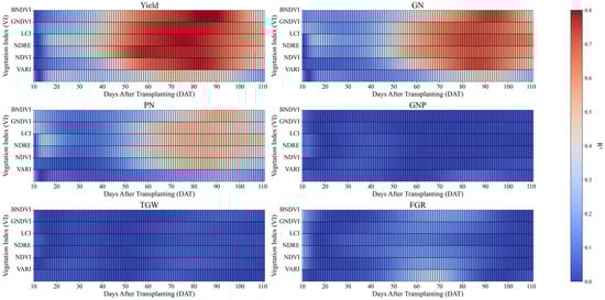2max typically occurred later than the peak VI values for all VIs, with this lag particularly pronounced for GN and PN. This suggests that vegetation growth patterns influenced GN and PN over an extended period, whereas the relationship between the VIs and yield was relatively immediate.