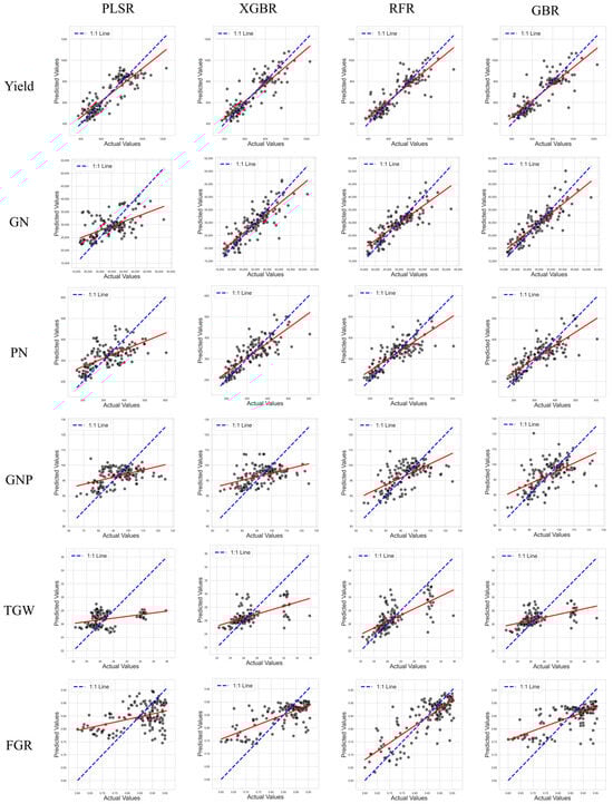 Table 9). On average, LCI and NDRE were better predictors of GN and PN, respectively. LCI showed strong performance in nonlinear models such as RFR, XGBR, and GBR while maintaining a relatively high accuracy in PLSR. NDRE, with its sensitivity to early and mid-growth stages, achieved high predictive performance for GN and PN as well as for yield in XGBR and GBR. Similarly, NDVI exhibited excellent performance in yield prediction, with R