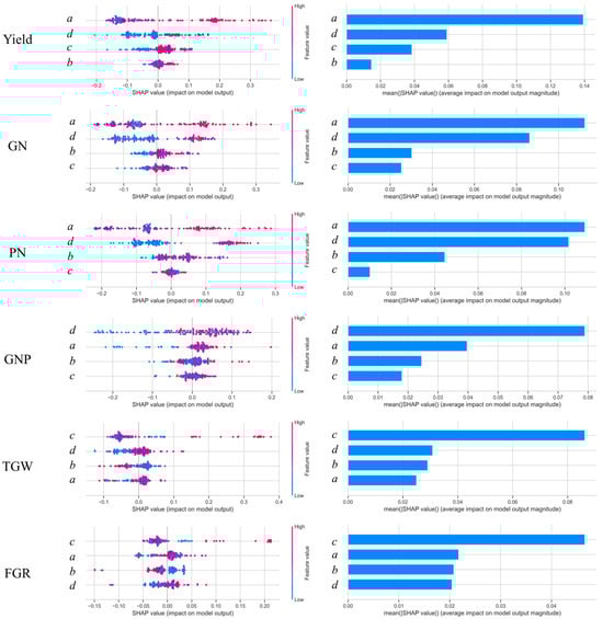 Overall, the SHAP value analysis underscores the dominant roles of a and c in predicting yield-related traits, underscoring their importance in NDVI-based models. This finding highlights the critical effect of maximum VIs and growth distribution patterns on yield estimation.