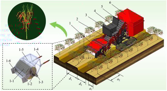 Pepper planting pattern and harvester structure: 1—Picking device; 2—First-level conveyor; 3—Traveling device; 4—Cab; 5—Second-level conveyor; 6—Collecting device; 1-1—Elastic tooth drum; 1-2—Drum hydraulic motor; 1-3—Ground wheel; 1-4—Hydraulic lifting cylinder; 1-5—Cover plate; 1-6—Pressing roller.