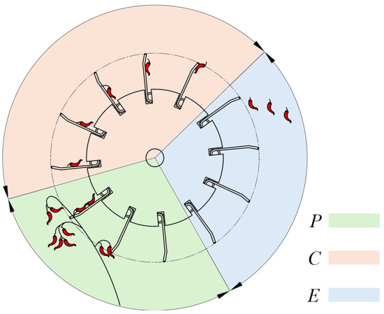 Casting section (C): This section is critical for the timely separation of the pepper fruits from the elastic teeth and determines the location where the fruits are ejected. Proper operation will ensure that the fruit is efficiently directed to the empty traveling section.