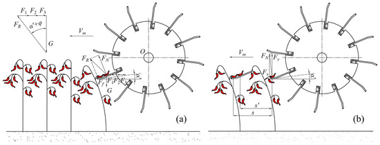 According to the movement of the pepper plant and the force, the role of the elastic tooth drum is divided into three successive processes: the elastic tooth and the pepper stalks are just in contact with the pepper stalks (the striking process), the pepper stalks and the pepper fruits are not separated by the supporting role of the drum (the stalk bending process), the pepper stalks and the pepper fruits are separated from the inertial force by the action of the rebound process.