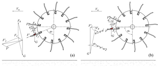 The movement of the peppers in the transport stage is relatively complex, with the elastic tooth performing a rotational movement while moving relatively outwards along the direction of the elastic tooth. At the beginning of the transporting stage, the pepper fruit is subjected to gravity G, the friction of the elastic tooth on the pepper fruit and the reaction force FN, the centrifugal inertia force F′ common action, and the friction of the elastic tooth on the pepper fruit and reaction force composite for the total reaction force FR. The composite of the above external forces can be obtained by the combination of the external force tilted downward, as shown in Figure 5a. Therefore, at the beginning of the conveying stage, the pepper fruit rotates along the elastic tooth and slides outward along the surface of the elastic tooth.