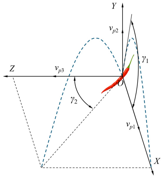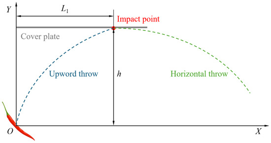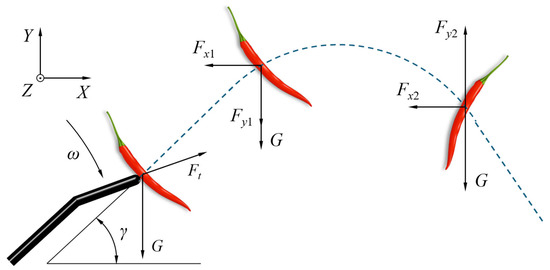 The research on the pepper fruit throwing process can be based on the research results of the throwing trajectory of straw particles. Considering the pepper fruit as a projectile thrown by the elastic tooth, and using the projectile theory to analyze the process of straw throwing, the following assumptions can be made: (1) the pepper fruit can be separated as a mass; (2) ignoring the rotation of the pepper fruit and the effect of its potential collision impact, the pepper fruit is only subject to its own gravity and the role of air resistance.