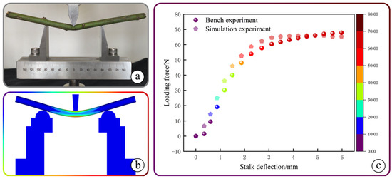 - Due to the simulation accuracy and time limitations, the mutual entanglement force between pepper plants is added as a constant value force in this paper, which increases the relative error between the simulation test and the bench test. In actual harvesting, the mutual entanglement force is affected by several factors such as overlap coefficient, moisture content, friction coefficient, etc. Further research is needed to investigate the change in the pepper plant–plant interaction force in the harvest process and its impact on the quality of the harvesting operation to further improve the reliability of the simulation results.