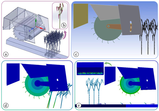 Computer-aided design and simulation have emerged as key research methods and have been widely used to investigate the interactions between mechanical components and crops during harvesting or separation processes [39,40]. These simulation-based approaches offer significant advantages, including the ability to overcome seasonal limitations, improve test efficiency and precision, accelerate research and development timelines, and minimize associated costs. For example, Wu et al. optimized vertical counter-roller parameters via ANSYS/LS-DYNA-based rigid-flexible coupling modeling and orthogonal simulations [41]. Similarly, Cao et al. optimized comb-clamp device structure and operational parameters through ANSYS/LS-DYNA dynamic simulations [42]. In another study, Li et al. established a finite element model of sweet sorghum cutting devices using ANSYS/LS-DYNA, optimizing blade angle, rotation speed, and forward speed through orthogonal experiments [43]. Building on these advances, this study uses simulation to investigate the interaction mechanisms between the drum with elastic tooth type picking mechanism and pepper plants. Specifically, the research focuses on analyzing the collision, separation, and ejection processes between the elastic teeth and pepper plants to mitigate harvest losses. The results aim to optimize the design parameters of the mechanism and provide valuable insights for further research aimed at reducing losses in pepper harvesting operations. The main contributions of this work are as follows: