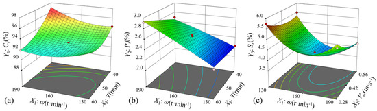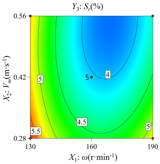 This contour plot shows the effect of X1 and X2 on Y3. The colors and contours in each area of the graph represent different Y3 values, with the colors gradually becoming darker from red to blue, indicating that the magnitude of Y3 values varies from high to low. The change in picking speed ratio essentially reflects the relative size relationship between X1 and X2. If X1 increases or X2 decreases, the picking speed ratio will increase and vice versa. As can be seen from Figure 15, when the picking speed ratio is small, Y3 is closer to the red region and has a larger value; when the picking speed ratio is large, Y3 is closer to the yellow region, which also leads to an increase in Y3. This indicates that the optimal value of Y3 is within a moderate range of the picking speed ratio, and therefore, the parameter of the picking speed ratio can be introduced to carry out relevant impact studies.