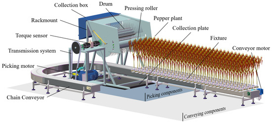 In conclusion, the pepper harvest device mainly consists of picking components and conveying components, as shown in Figure 13. Among them, the picking part mainly contains a picking motor, transmission system, torque sensor, rackmount, collection box, drum, pressing roller, and collection plate; the conveying component mainly includes a chain conveyor, fixture, and conveyor motor. In addition, the control system can adjust the start–stop and speed of the picking motor and conveyor motor to realize the operation parameters such as picking speed, conveyor line speed, and conveyor belt end position.