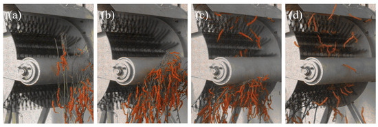 When the bench test was carried out, the picking process was filmed using a high-speed camera system, and the key frames were extracted, as shown in Figure 16. Figure 16a shows the upright state of the pepper plants before contacting the pressing roller. As can be seen in Figure 16b, the pressing roller bent the pepper plants before they were fed into the drum. During this process, the elastic potential energy is gradually accumulated as the conveyor moves forward and the pepper plants are continuously bent. As can be seen in Figure 16c, after the front row of pepper plants has passed through the pressing roller, the elastic potential energy is converted into kinetic energy and accelerates the rebound into the drum. Figure 16d shows the state of all the pepper plants being combed by the drum after completely passing through the pressing roller.