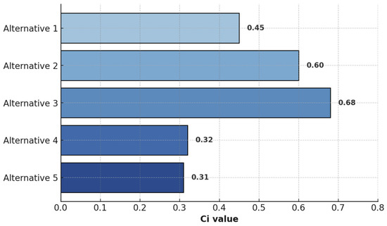 - Computation of the TOPSIS Performance Coefficient (Ci): based on the calculated distances, a performance index (Ci) was assigned to each alternative. This final step allowed for the ranking of agritourism development strategies based on their quantitative viability. Alternatives with higher Ci scores were deemed more suitable for investment and policy implementation, while those with lower scores indicated areas requiring further development or strategic adjustments.
