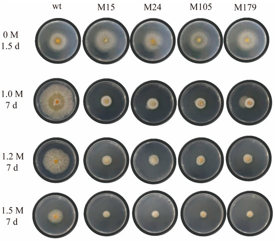 On PDA plates without NaCl (0 M), all strains exhibited normal growth. However, with increasing NaCl concentrations, salt stress adversely affected the growth of all strains. While the growth of wt was inhibited under salt stress, it was still capable of some mycelial expansion. In stark contrast, the irradiated mutant strains were markedly more sensitive to salt stress than wt, showing severely impeded growth. Their mycelia failed to spread outward and instead contracted into compacted clumps. Despite this, a small portion of the mycelia managed to grow upward, resulting in the formation of denser colonies (Figure 1). By measuring the colony diameter differences of these colonies, it was discovered that the M15 mutant strain exhibited growth consistent with wt under normal circumstances. However, under salt stress conditions, its growth was the poorest among all strains (Figure S2). Despite their impaired salt tolerance, these mutants became valuable subjects for further investigation.