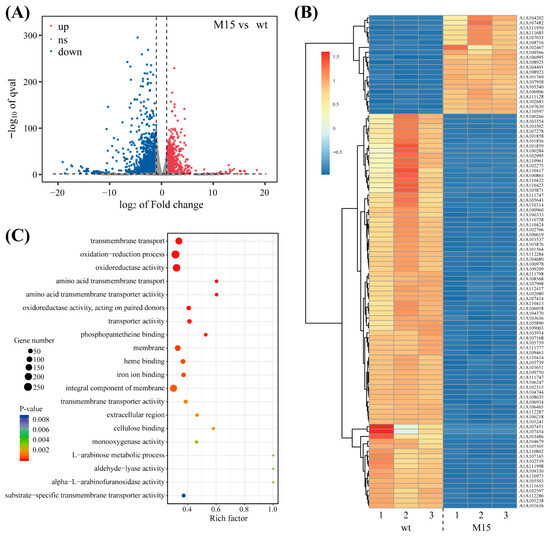 The statistical analysis revealed that the efficiency of our sample data exceeded 90.00%, and the quality, as measured by Q20%, was above 99.50%, indicating that the dataset met our quality standards. We then assessed the coverage of expressed genes, which represented the proportion of expressed genes out of the total gene pool. Preliminary analysis showed that, under 1.0 M NaCl conditions, the mutant strain M15 had 1448 upregulated genes and 1635 downregulated genes compared to wt under the same conditions (Figure 2A). Differentially expressed genes (DEGs) are the genes that are either upregulated or downregulated between samples or within the same sample after different treatments. Gene selection was based on fold change (FC) and significance level, with criteria set at FC ≥ 2 or FC ≤ 0.5 (absolute log2 FC ≥ 1) and q-value < 0.05 [42]. This threshold helped identify genes with significant statistical differences across multiple groups, leading to the identification of many salt-stress-specific DEGs. Under 1.0 M NaCl conditions, there were numerous highly reliable DEGs between the wt and the mutant strain across all transcripts. Specifically, 21 genes were significantly upregulated and 77 genes were significantly downregulated under salt stress in the mutant strain. The expression of gene A1A107451 in wt is upregulated by more than 1000 times compared to M15, so this gene will be studied further in the future (Figure 2B). Based on these screening results, we employed GO enrichment analysis and KEGG enrichment analysis to identify gene annotations and biosynthetic pathways highly associated with salt stress for further investigation.