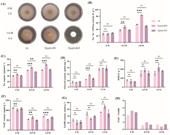The fresh spore suspension of the NJAU4742 knockout strain (Tgmfs-KO), and the overexpression strain (Tgmfs-OE) were cultivated on the PDA medium at 28 °C. PDA media with three different NaCl concentrations (0 M, 0.5 M, and 1.0 M) were prepared for inoculation after the sterilization at 115 °C for 30 min. About 2.5 μL of spore suspension (107 spores·mL−1) was inoculated on the PDA medium, which was covered with cool and sterilized cellophane paper to collect mycelia. After 7 days of growth, the mycelia were scraped, and their intracellular substance content was analyzed using the glycerol extraction kit (Applygen E1013, Beijing, China), SOD (superoxide dismutase) enzyme activity assay kit (Solarbio BC0170, Beijing, China), NAD+ and NADH content assay kit (Solarbio BC0310, Beijing, China), Na+/K+-ATPase activity assay kit (Solarbio BC0065, Beijing, China), and Sodium (Na) Colorimetric Assay Kit (Elabscience E-BC-K207-M, Wuhan, China). At least three biological replicates were carried out for each experiment, and the bars indicated the standard error of the mean (SEM).