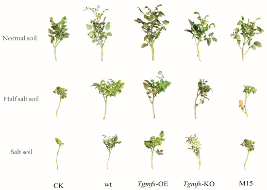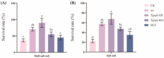 The exogenous addition of different spore suspensions of Trichoderma strains can reflect their influences on the growth of tomato seedlings under salt-stress conditions. In this study, the results indicated that all tomato seedlings in all treatment conditions grew normally under normal soil conditions. However, as the salt concentration increased, it can be clearly seen in the figures that in the pots containing half salt soil, tomato seedlings began to show yellowing, wilting, and desiccation of leaves. In the untreated condition, the yellowing of tomato seedlings was the most obvious. Under pure salt soil conditions, the above situations were more obvious for tomato seedlings. Some seedlings showed severe wilting and needed external support to grow upward. In the untreated condition, the damage degree of tomato seedlings was the most severe (Figure 4 and Figure S4). The addition of Trichoderma alleviated the salt stress suffered by tomato seedlings in all treatment conditions. All tomato seedlings were able to survive and grow normally under normal soil conditions. With the increase in salt concentration, all the treated tomato seedlings began to die. Under the condition of half salt soil and salt soil, the highest survival rate was achieved in the Tgmfs-OE treatment, reaching 90% and 67.5%. Under these two conditions, the mortality rate of tomato seedlings was the highest in the untreated condition. Especially under pure salt soil conditions, the survival rate was merely 22.5% under the condition without Trichoderma treatment (Figure 5).