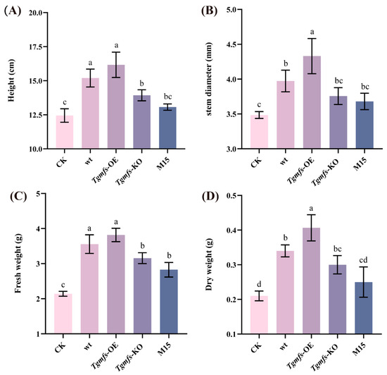 The variation in biomass of tomato seedlings under salt soil conditions. (A–D) In the salt soil concentrations, the physiological indices of tomato seedlings in each treatment were measured, namely plant height (A), stem diameter (B), fresh weight (C), and dry weight (D). Different lowercase letters indicate statistically significant differences between treatments (one-way ANOVA, p < 0.05).