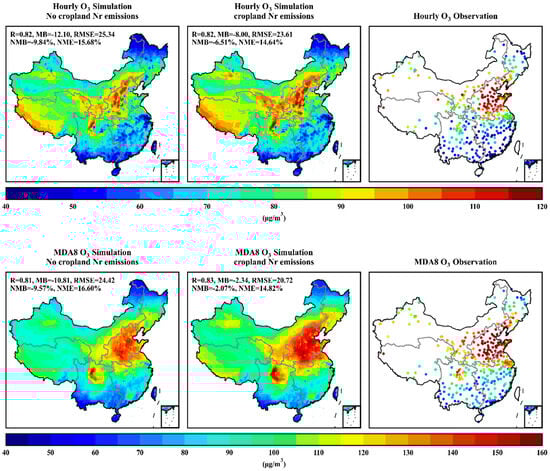 Spatial distributions of simulated and observed hourly O3 and MDA8 O3 with and without considering cropland Nr emissions across China in June 2020.