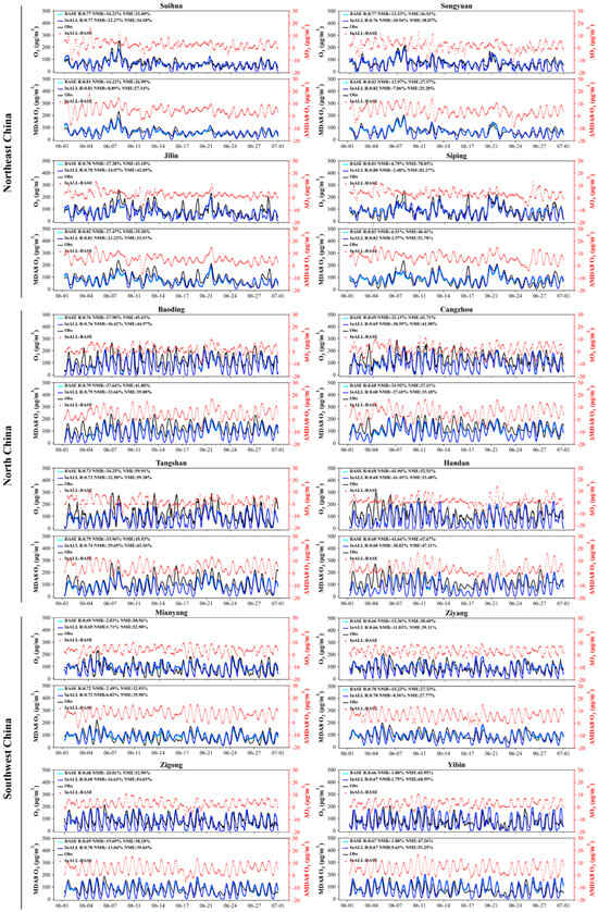 This study found that cropland Nr emissions significantly impacted regional O3 formation in China during June 2020, primarily concentrated in the NC region and some parts of SW and NE, as described in Section 3.1. To further assess the influence of cropland Nr emissions on O3 formation, we selected agriculture-dominated cities in these regions, such as Suihua, Songyuan, Jilin, and Siping in the NE region, Baoding, Cangzhou, Tangshan, and Handan in the NC region, and Mianyang, Ziyang, Zigong, and Yibin in the SW region, and analyzed the hourly variation in simulated and observed O3 and MDA8 O3 under the BASE and InNr scenarios (Figure 6).