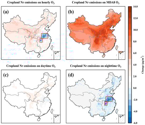 Spatial distribution of ∆O3 (a) and ∆MDA8 O3 (b) with and without cropland Nr emissions, along with ∆O3 during daytime (c) and nighttime (d) across China in June 2020. Red boxes emphasize the critical areas where hourly O3 decreases due to cropland Nr emissions.