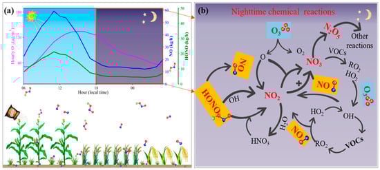 (a) Monthly diurnal variations in observed ozone concentrations and simulated cropland NO and HONO emissions in southern NC of China during June and (b) the major chemical transformations among surface ozone and cropland Nr species at nighttime.