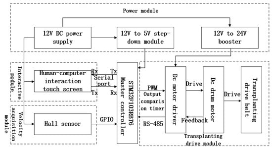 The electromechanical control system for transplanting rhizome-type traditional Chinese medicinal herbs is primarily comprised of an STM32 main control chip (Geneva, Switzerland), a Hall sensor (Shenzhen, China), a human–machine interaction touchscreen (Shenzhen, China), a power converter (Guangzhou, China), an actuating motor (Ningbo, China), a motor driver (Ningbo, China), a 12 V power supply (Huzhou, China), and a voltage-reducer module (Shenzhen, China). The hardware structure block diagram of the control system is illustrated in Figure 1. The main controller and transformer modules are integrated onto a unified control board.