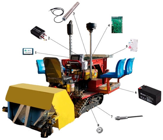 Schematic diagram of the whole machine structure. (1) Human–computer interaction touch screen; (2) Power converter; (3) DC drum motor; (4) The main controller; (5) Air switch; (6) Power supply; (7) Hall sensor; (8) Speed gear.