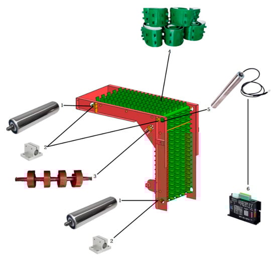 Schematic diagram of conveying transplanting parts. (1) Stainless steel roller; (2) Bearing support; (3) Tensioning wheel device; (4) Separator conveyor belt; (5) DC drum motor; (6) Drive.