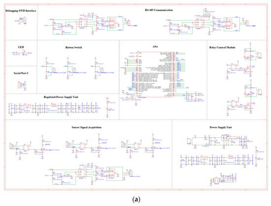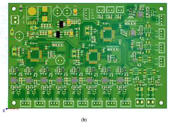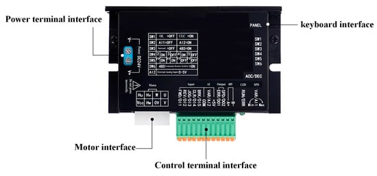 Figure 9 displays the drum motor driver, illustrating the physical-level interfaces as well as the modules connected to each interface. The motor is equipped with an integrated sensor to measure its actual speed, which is then inputted into the drum motor driver. Data transmission between the main controller and the drum motor driver is facilitated through the RS-485 communication protocol. The main controller calculates the theoretical speed (nroll) of the drum motor and determines the deviation between this theoretical value and the actual measured speed according to Formula (7). This deviation is inputted into the PID controller, which computes the control signal based on a fuzzy PID algorithm. Subsequently, the calculated control signal for the drum motor is used to adjust the duty cycle of the PWM (Pulse Width Modulation) signal. The adjusted PWM signal is then outputted to the motor’s drive circuit, enabling precise control of the drum motor’s speed.