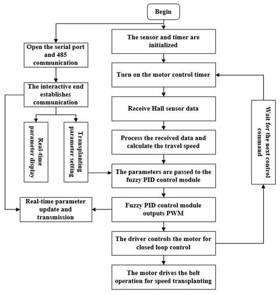 The schematic diagram of the entire machine structure is shown in Figure 2. Upon system power-up, the 12 V power supply provides electrical power to the human–machine interaction touchscreen and Hall sensor. This power is then boosted to 24 V by a power converter to serve as the energy source for the DC drum motor. Additionally, a 12 V to 5 V step-down module within the board supplies power to the main controller and connects to the system’s main control board’s step-down module, further reducing the voltage to 3.3 V/5 V for the microelectronic components. When the system power supply is activated, the operator engages the human–machine interaction touchscreen, inputs operational parameters on the parameter input interface, and confirms the settings for saving. The touchscreen then transmits operational parameters, such as planting distance or motor speed, to the system controller via serial communication. The system controller processes this information and sends a PWM signal with a corresponding duty cycle to the motor driver. Upon receiving this PWM signal, the driver initiates the rotation of the DC drum motor, while the operator simultaneously operates the transplanting equipment to commence movement. The Hall sensor speed-monitoring device, positioned on the chassis track, begins collecting speed signals. It calculates the real-time operational speed by leveraging the system’s counter and time frequency. This calculated speed is used to determine the theoretical desired operational speed of the motor. Meanwhile, the Hall sensor embedded within the DC drum motor provides the actual operational speed, serving as feedback for system control. Both speeds are input into the fuzzy PID controller module within the control system software, which outputs a corrected PWM signal to the driver. The driver controls the DC drum motor’s operation according to this algorithm. Additionally, the system communicates with the touchscreen via serial communication to provide real-time operational updates to the operator for their review. This process enables the precise transplanting and closed-loop control of root- and stem-based traditional Chinese medicinal herbs.