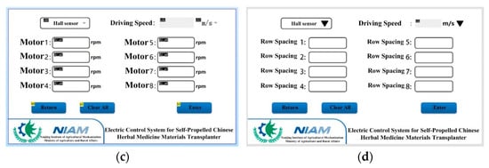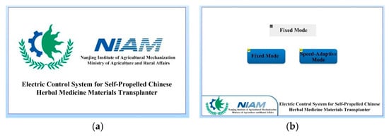 The HMI design diagram presented in this paper is depicted below. The design primarily comprises a boot-up background and three operational interfaces. As illustrated in Figure 6a, upon this background, the main control unit initiates the initialization of the timer and serial port. Simultaneously, during its initialization event, the touchscreen configures the baud rate to 115,200 (via the program parameter bauds = 115,200), aligning it with the MCU’s default baud rate, thereby establishing the initial conditions for communication. Figure 6b showcases the interface for selecting the transplanting mode. Within this interface, users can select the desired mode based on their requirements. Two modes are available: the Fixed Mode, wherein the transplanting control system operates according to the user-inputted operational speed, and the Speed-Adaptive Mode, which adjusts the transplanting speed in real time according to the driving speed, minimizing disturbances to the control system during the transplanting process. Additionally, users can input the coefficient for the transplanting motor on this interface to tailor the transplanting speed to different operational demands. Figure 6c,d depict the screens for the Fixed Mode and Speed-Adaptive Mode, which enable users to input operational parameters such as planting distance and motor speed.