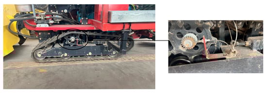 In this paper, a combination of Hall sensors and gear-speed measurement is employed. The measuring gear is coaxially installed with the track’s driving wheel, while the Hall sensor is mounted radially to the gear, maintaining a consistent distance from the gear tip, as illustrated in Figure 7. The fundamental principle behind Hall sensor based speed measurement is that as the track’s driving wheel rotates the gear, its tooth tips periodically come into close proximity to and then move away from the Hall sensor, altering the magnetic field intensity surrounding the sensor. The Hall sensor detects these fluctuations in magnetic field strength and converts them into electrical signals. By analyzing the frequency or periodicity of these electrical signals, the rotational speed of the gear can be determined, which subsequently allows for the calculation of the track’s linear velocity.