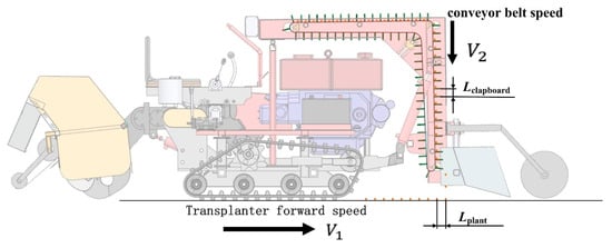 The schematic diagram of the conveying transplanting operation is shown in Figure 8. In practical applications, to ensure consistent transplanting speed and distance, the conveyor belt speed must be adjusted in real time as the forward speed changes. The conveyor belt speed, combined with the distance between partitions on the belt, determines the seedling transplanting frequency within a unit of time. Similarly, the forward speed of the transplanter and the transplanting distance between seedlings also ensure the seedling transplanting frequency. When these two frequencies are equal, the calculation of Formula (4) can be derived: