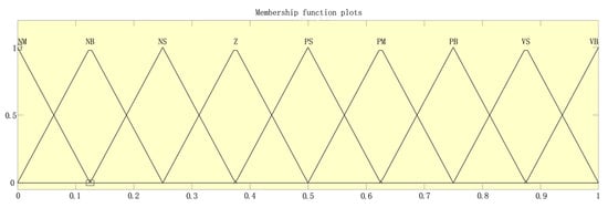 For the actual operation scenarios of motor speed control, the fuzzy control domain language expression variables for system deviation e, the rate of change of system deviation , and the tuning adjustment values (change in proportional coefficient), (change in integral coefficient), (change in differential coefficient) of fuzzy PID controller parameters are set as {NB (negative large), NM (negative medium), NS (negative small), Z (zero), PS (positive small), PM (positive medium), PB (positive large), VS (very small), VB (very large)}. NB indicates a significant negative deviation, necessitating substantial adjustments by the system to promptly reduce errors. NM signifies a moderate negative deviation, requiring moderate adjustments to decrease errors. NS represents a slight negative deviation, prompting minor tweaks to approach the target value. ZO denotes no deviation, with the system maintaining its current state or making minor adjustments for stability. PS indicates a slight positive deviation, necessitating minor adjustments to reduce errors and approach the target. PM signifies a moderate positive deviation, requiring moderate adjustments to decrease errors. PB represents a significant positive deviation, prompting substantial adjustments by the system to promptly eliminate errors. VS is utilized for fine-tuning extremely minor deviations to ensure system accuracy. VB is employed for emergency adjustments in cases of extreme deviations to maintain system stability.