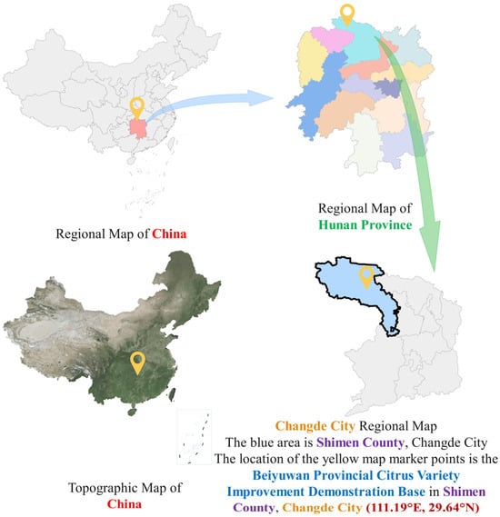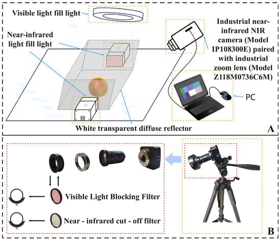 As shown in Figure 1, the citrus samples used in this study were collected from the Beiyuwan Provincial Citrus Variety Improvement Demonstration Base in Shimen County, Changde City, Hunan Province, China (111.19° E, 29.64° N). Data collection was conducted at this site in November 2024. Citrus samples were harvested from the fields on sunny days and then transported indoors for further processing. As illustrated in Figure 2A, citrus fruits collected from the fields were placed on an indoor flat surface, and images were captured using a near-infrared industrial camera (IP108300D model, TQ-Tech, Hangzhou, China). A diffuse shadowless light source and 850 nm infrared light were employed for illumination, with other light sources shielded during image acquisition. The camera was equipped with an industrial zoom lens (Z118M0736C6M model, Tuqian Technology, Hangzhou, China) with a focal length of 7–36 mm and an aperture of F2.8 (Figure 2B). To capture RGB and NIR images simultaneously, a manual filter-switching method was employed utilizing a dedicated threaded interface to fix the filter drawer in front of the lens. The system used an infrared cutoff filter (SPF650 model, Weidon, Shenzhen, China) that allowed wavelengths below 700 nm to pass and a visible light cutoff filter (SPF750 model, Weidon, Shenzhen, China) that permitted wavelengths above 750 nm. The images were saved in JPG format with a resolution of 1920 × 1080. A total of 1680 images (840 sets) were captured, encompassing common citrus surface defects, such as cankers, pests, melanoses, and cracks.