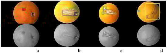 Examples of RGB + NIR images and annotations in the dataset. Red rectangular box (a): example of canker annotation; purple rectangular box (b): example of pest annotation; green rectangular box: example of crack annotation (c); yellow rectangular box (d): example of melanose annotation; blue rectangular box (a,c,d): example of navel annotation; and black rectangular box (b): example of peduncle annotation.