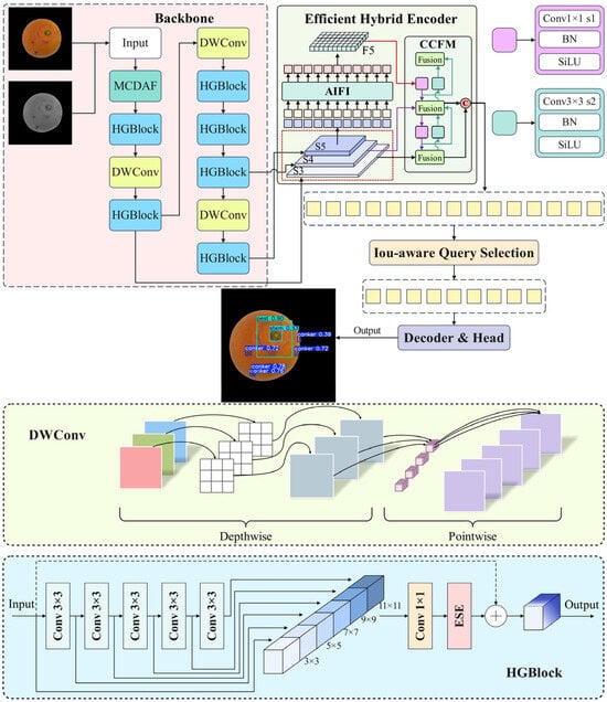 This study aimed to enhance citrus defect detection by integrating visible light and NIR information, leveraging the strengths of both modalities for improved performance. To achieve this, we proposed RT-DETR-MCDAF serving as a multimodal citrus defect detection network based on RT-DETR. It efficiently fused multimodal features while utilizing the Vision Transformer (ViT) network’s global processing capabilities for more precise defect detection. As illustrated in Figure 4, we introduced a Multimodal Compound Domain Attention Fusion (MCDAF) module designed with an attention mechanism to effectively integrate RGB and NIR image features. The fused feature space was then adopted as an input for RT-DETR, enabling more accurate and robust defect detection.