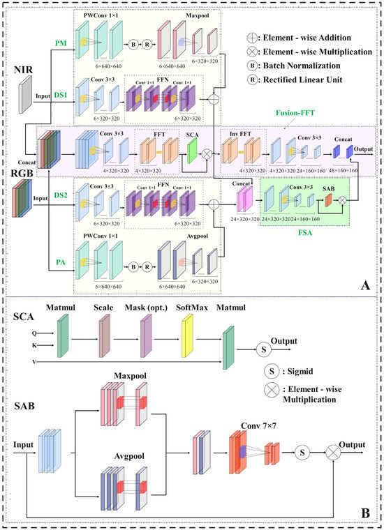 The Fusion-FFT module (Figure 6A) represented the frequency-domain processing pathway. The visible light and NIR images were first resized to 640 pixels in width and height, with the RGB image containing three channels and the NIR image containing a single channel. These images were concatenated along the channel dimensions to form a four-channel fused image similar to the method shown in Figure 5. However, simple concatenation did not sufficiently enhance the cross-modal feature correlations. To address this, convolutional operations were applied for downsampling, thereby reducing the image dimensions to 320 × 320 pixels. This convolution fused the RGB and NIR information by performing a local weighted summation through kernels, effectively modeling the cross-channel correlations, and extracting the higher-level semantic features while reducing noise. Subsequently, the feature map underwent a Fast Fourier Transform (FFT) to shift it into the frequency domain, where high-frequency components such as defect edges and texture details were separated from low-frequency components such as uniform surface regions. To enhance feature representation, a Self-Attention-driven Channel Attention (SCA) module with residual structures was introduced. The self-attention mechanism mapped the key, value, and query within the same sequence block, establishing dependencies between local and global features. The frequency domain provided clearer feature distinctions, thereby improving self-attention effectiveness. A Sigmoid-based channel gating mechanism was applied at the output to activate the key features while reducing overfitting, while the residual structure ensured that the essential frequency details were preserved. After frequency-domain processing, the feature map was transformed into the time domain using inverse FFT to restore its original dimensions. A final 3 × 3 convolution was then applied for additional downsampling, further refining the local semantic information while adjusting the feature dimensions to 24 × 160 × 160 and preparing them for subsequent processing. The frequency-domain transformation can be expressed by Equation (1).